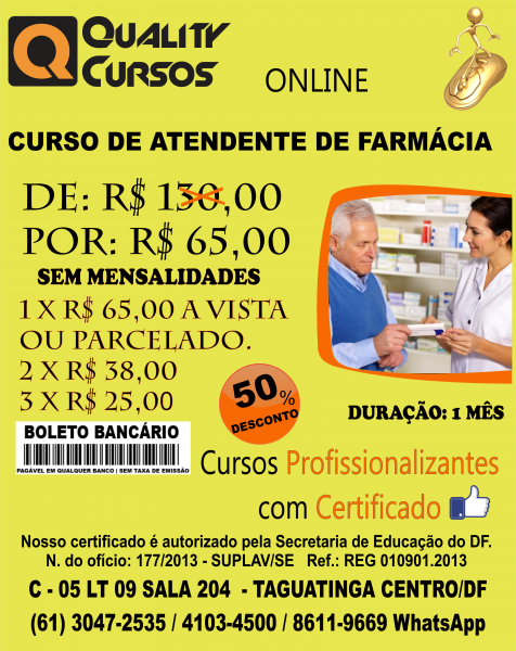 Ao término do curso, você estará qualificado para trabalhar em Farmácias e Drogarias, Farmácias Hospitalares, Populares e Postos de Saúde.